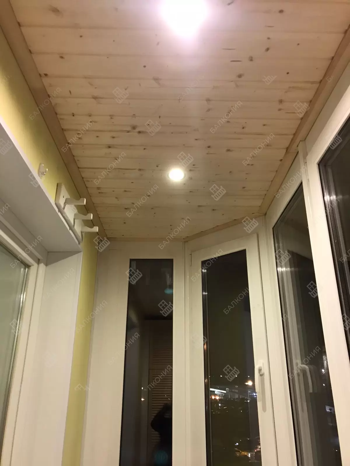 Сделано французское, эркерное остекление лоджии и установлен балконный блок из профиля Rehau GRAZIO 70 с энергосбережением. Сделано утепление по кругу. Отделка стен и потолка выполнена вагонкой из сосны, полы — ламинат. Материал предоставлялся компанией «Балкония» согласно пожеланиям заказчика.