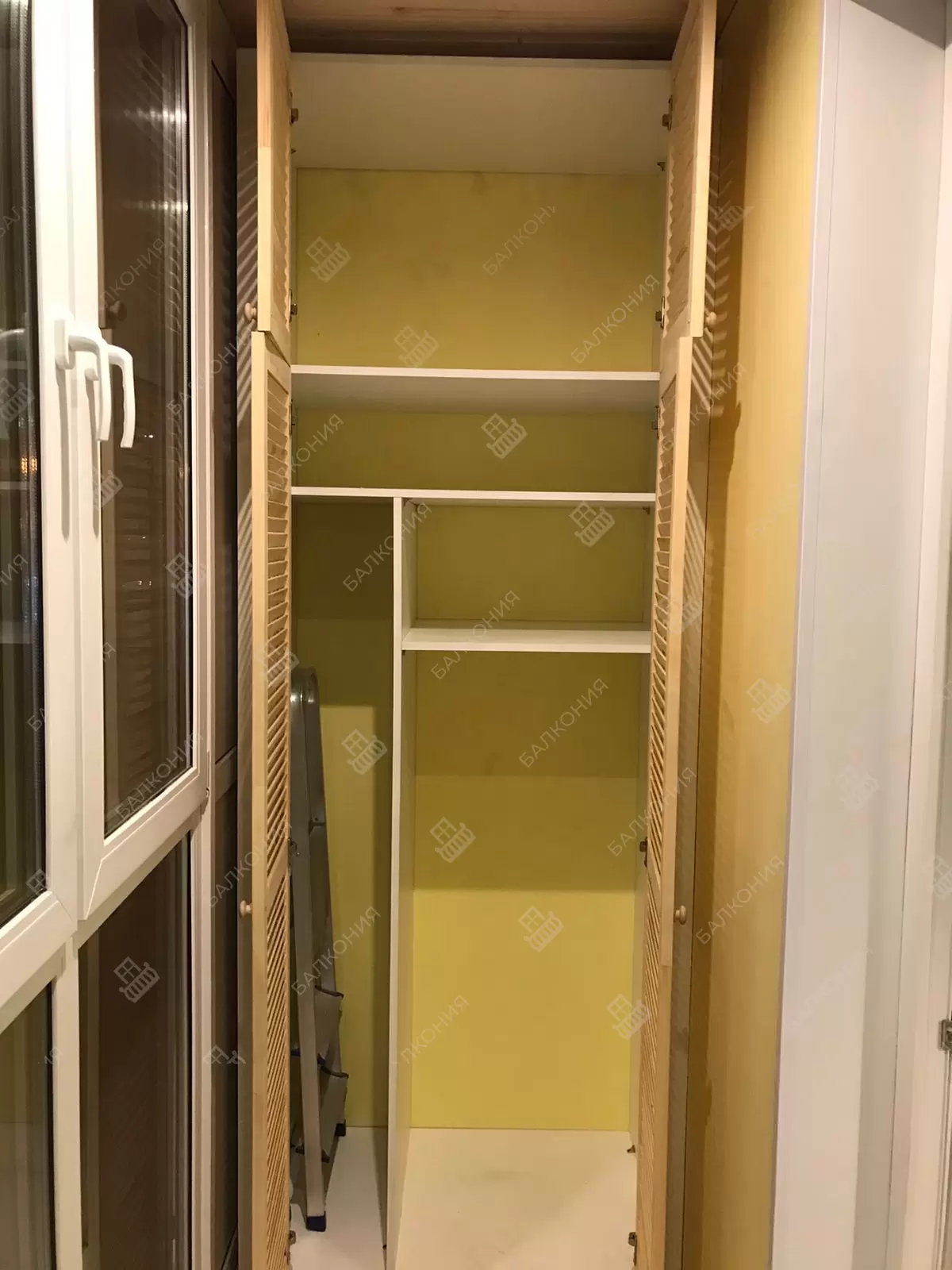 В данном объекте выполнено решение по отделке дополнительного помещения на балконе. Отделка стен и потолка выполнена деревянной вагонкой. Установлена настенная вешалка для велосипеда. Установлен встроеваемый деревянный шкаф. Выведено и разведено по балкону электричество.