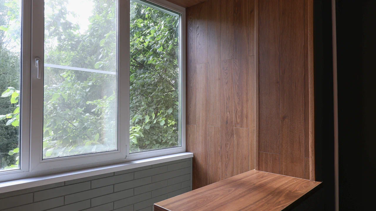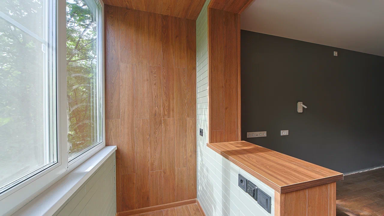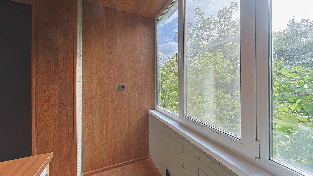 Обшивка: Комбинированная облицовка различными видами материала: стеновой паркет и ламинат. Остекление: Профильная система Rehau Grazio 70 с качественной немецкой фурнитурой Roto обеспечивает герметичность и долговечность конструкции. Электрика: Полностью выведены электрические сети, установлены осветительные приборы. Для дополнительного комфорта установлено напольное покрытие с функцией подогрева — теплый пол инфракрасного типа.Заказчик высоко оценил проделанные работы и остался доволен результатом. Дизайнерская концепция оформления позволила создать комфортную зону отдыха на лоджии площадью 3 м².