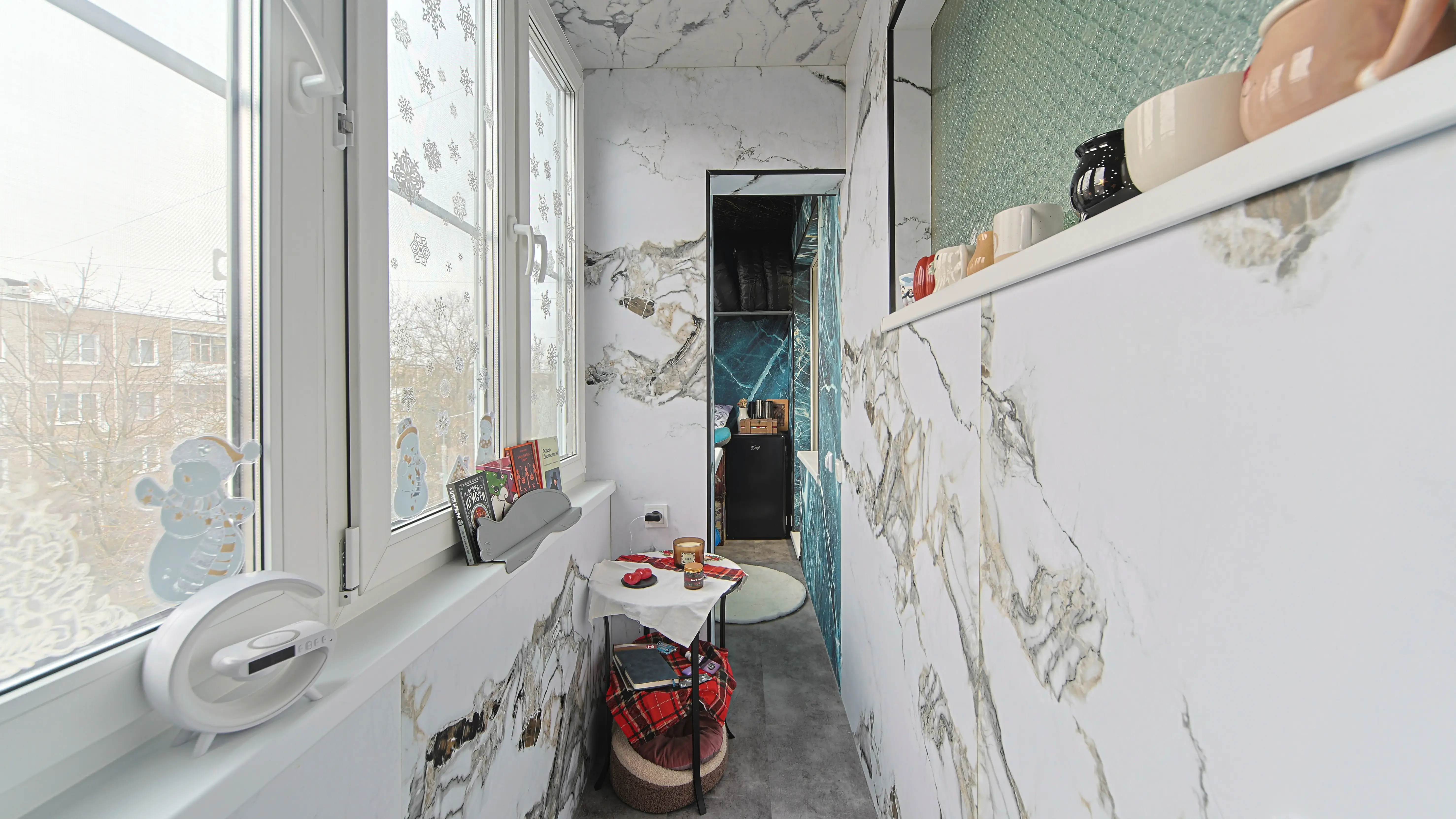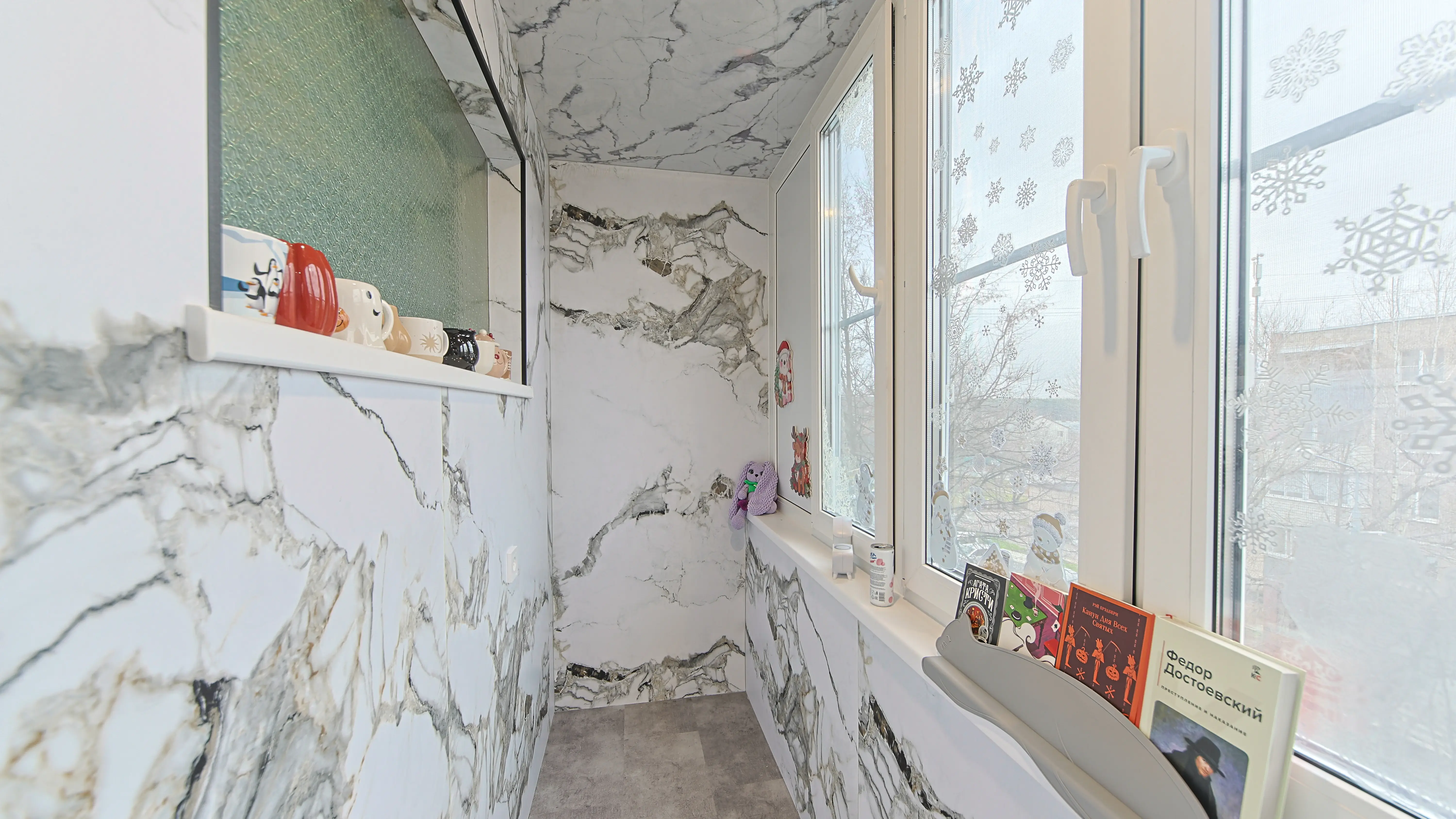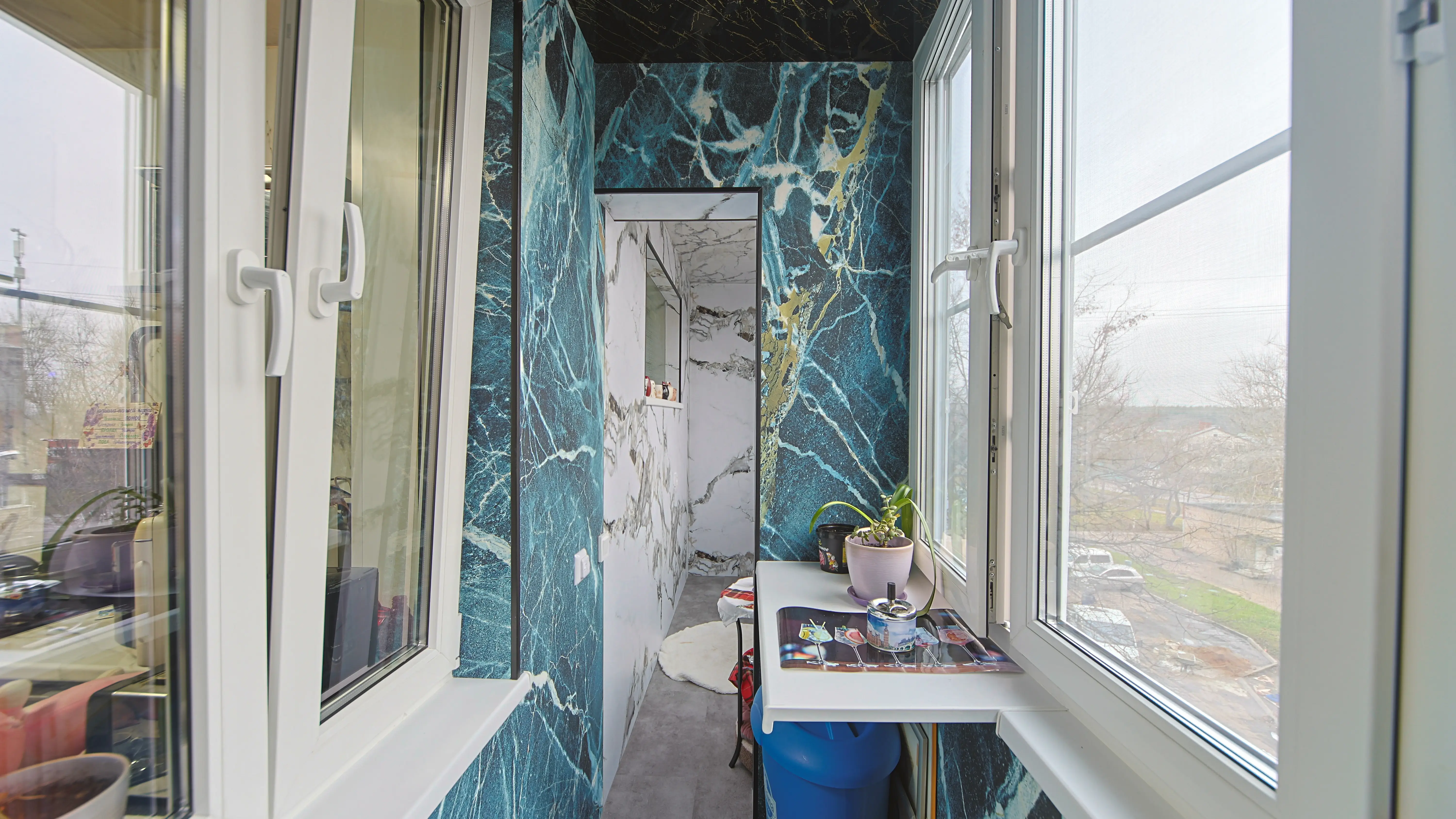 Лоджия разделена на две зоны. В детской использован светлый гибкий мрамор и глянцевый потолок, аккуратно оформлено окно в подъезд. Зона хозяйки выполнена в синем оттенке, потолок — в тёмном мраморе с золотыми прожилками. Установлен новый балконный блок и создано удобное место с выступающим подоконником.