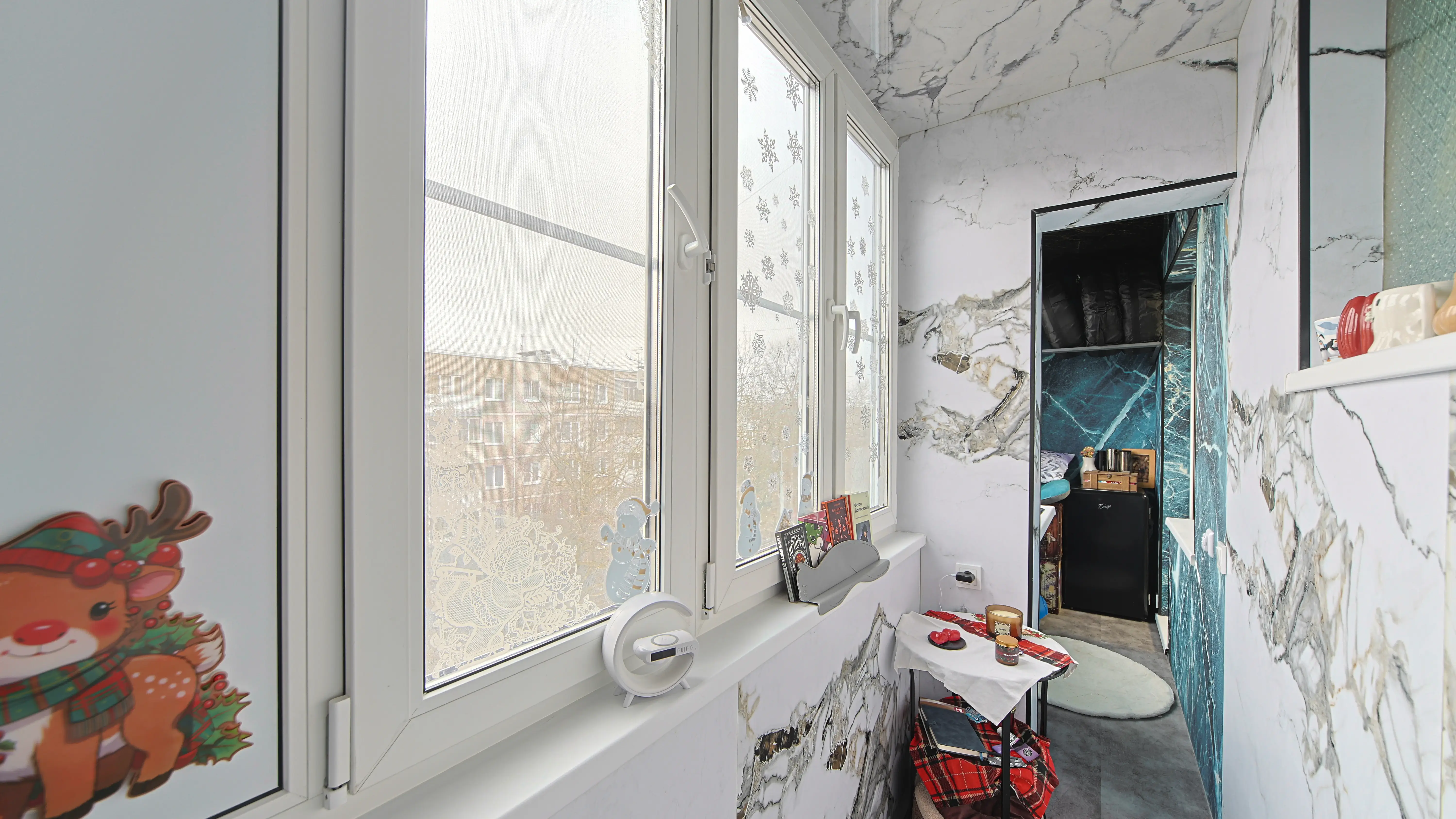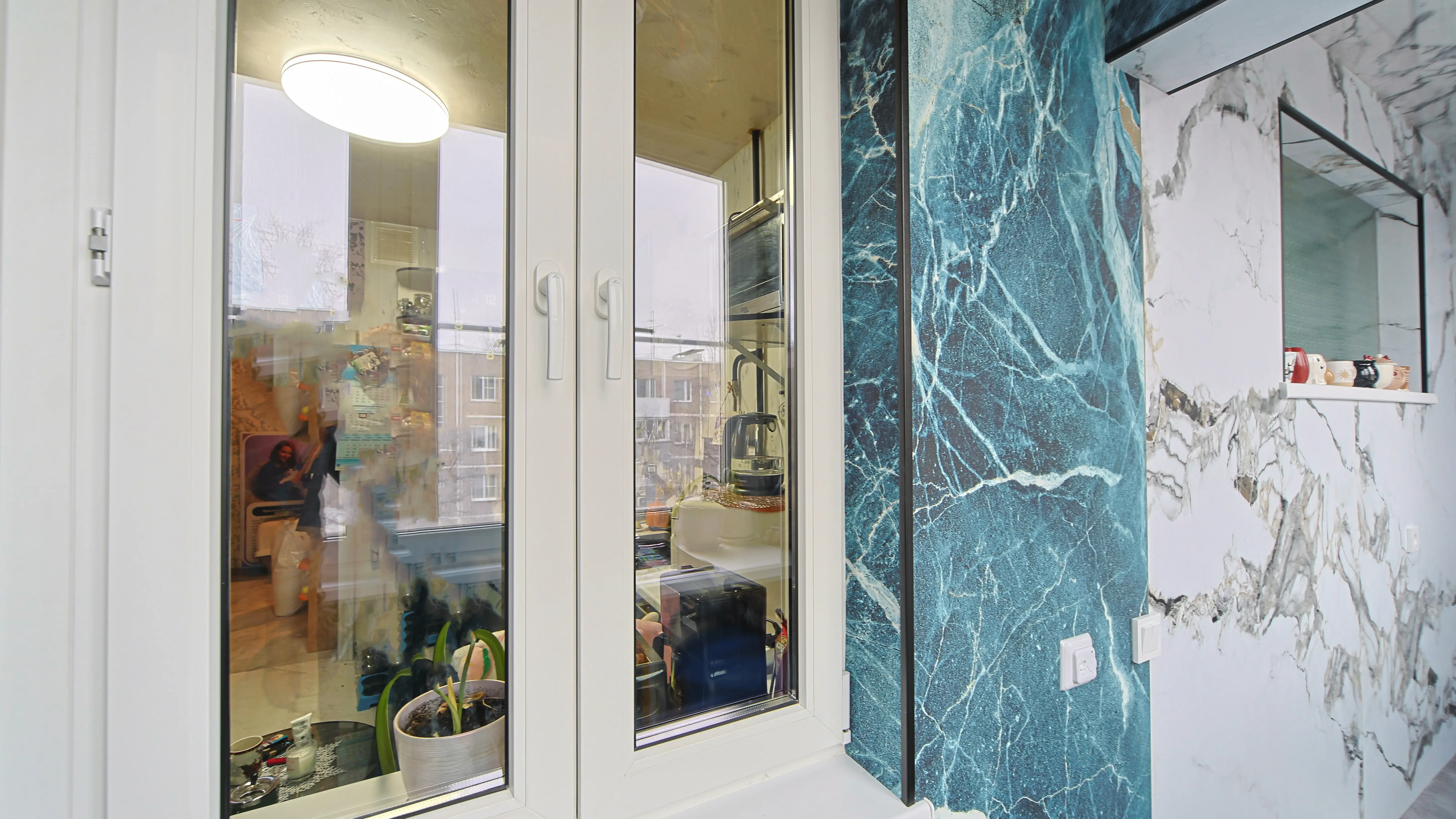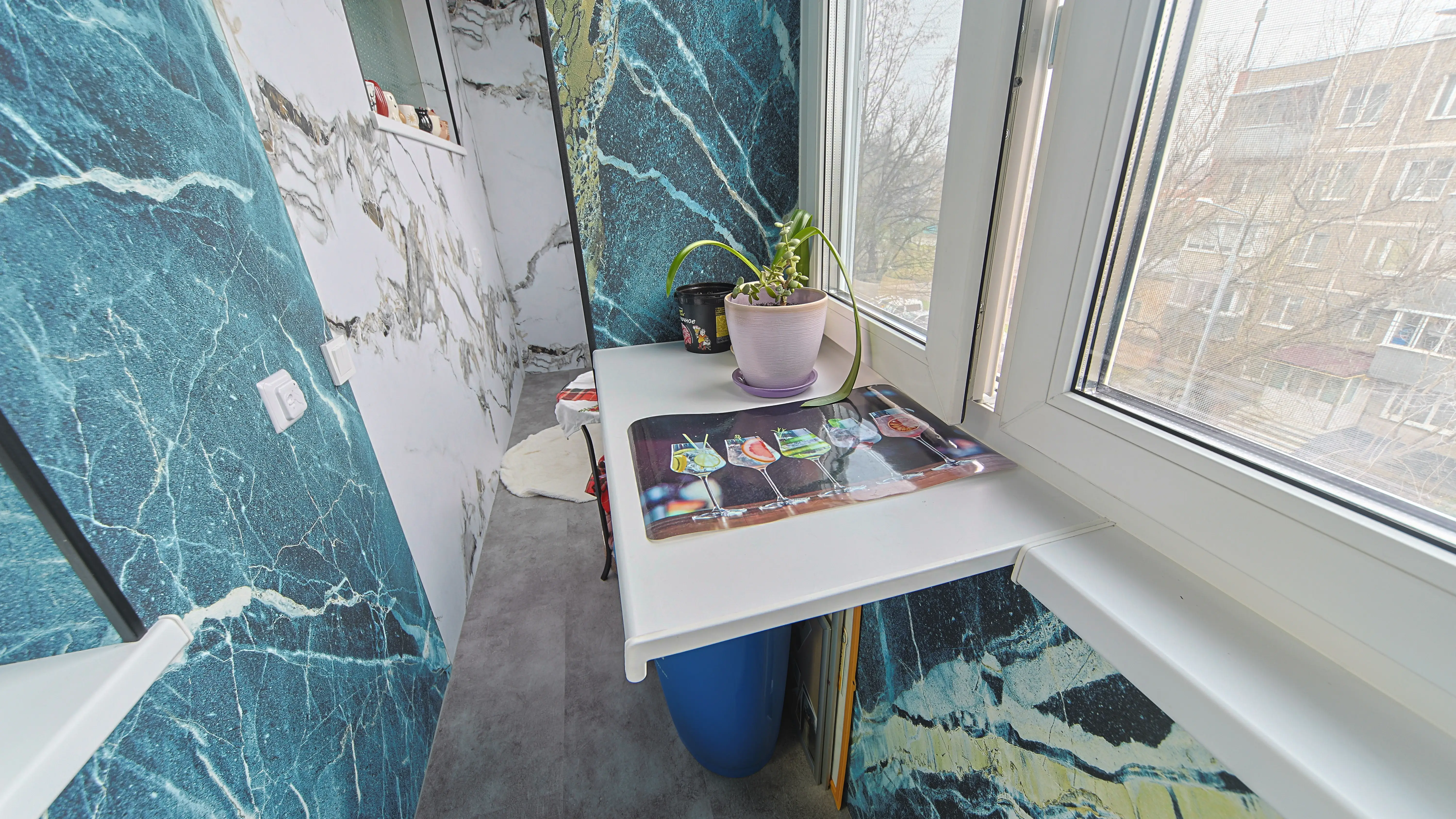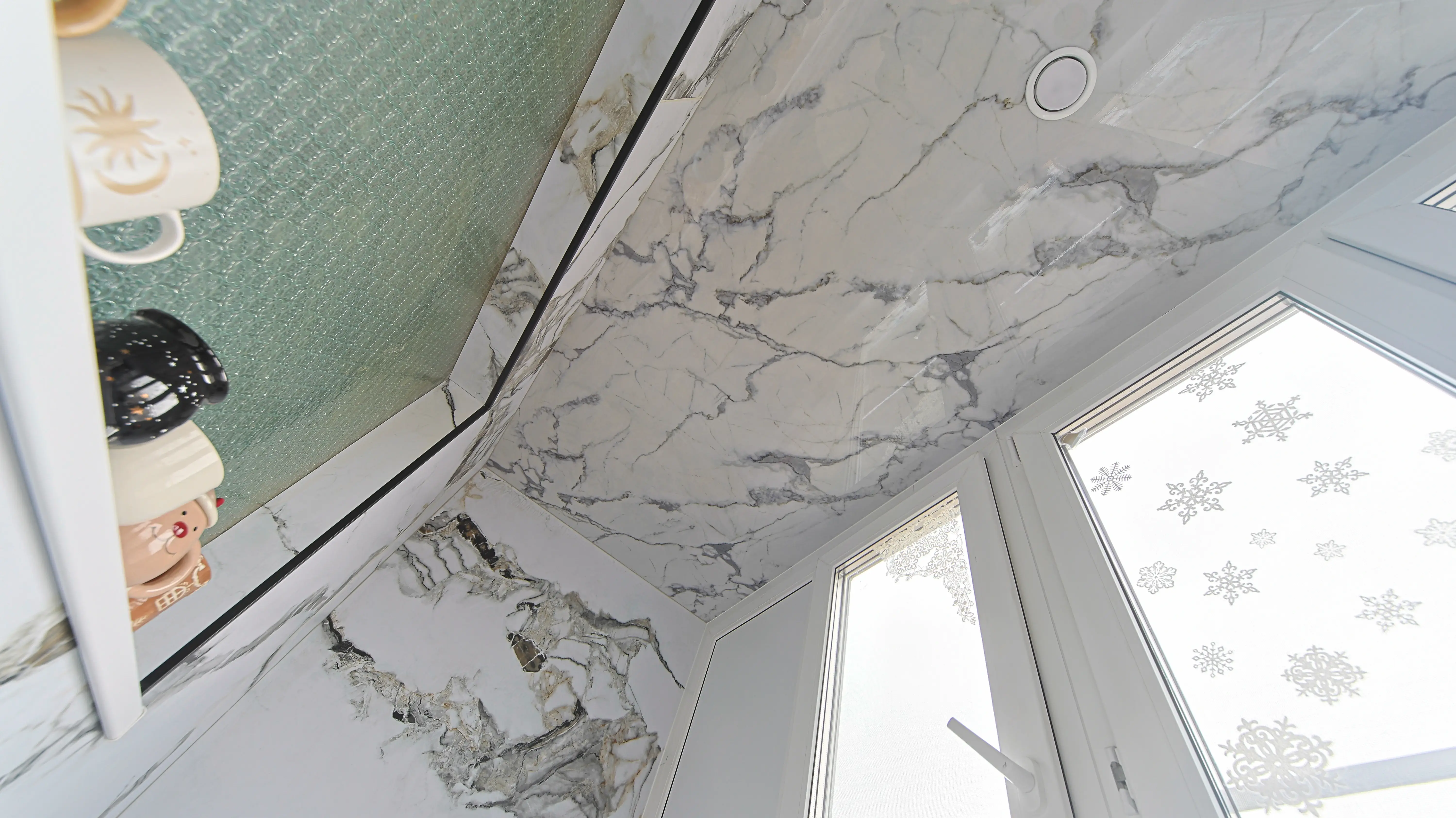 Лоджия разделена на две зоны. В детской использован светлый гибкий мрамор и глянцевый потолок, аккуратно оформлено окно в подъезд. Зона хозяйки выполнена в синем оттенке, потолок — в тёмном мраморе с золотыми прожилками. Установлен новый балконный блок и создано удобное место с выступающим подоконником.