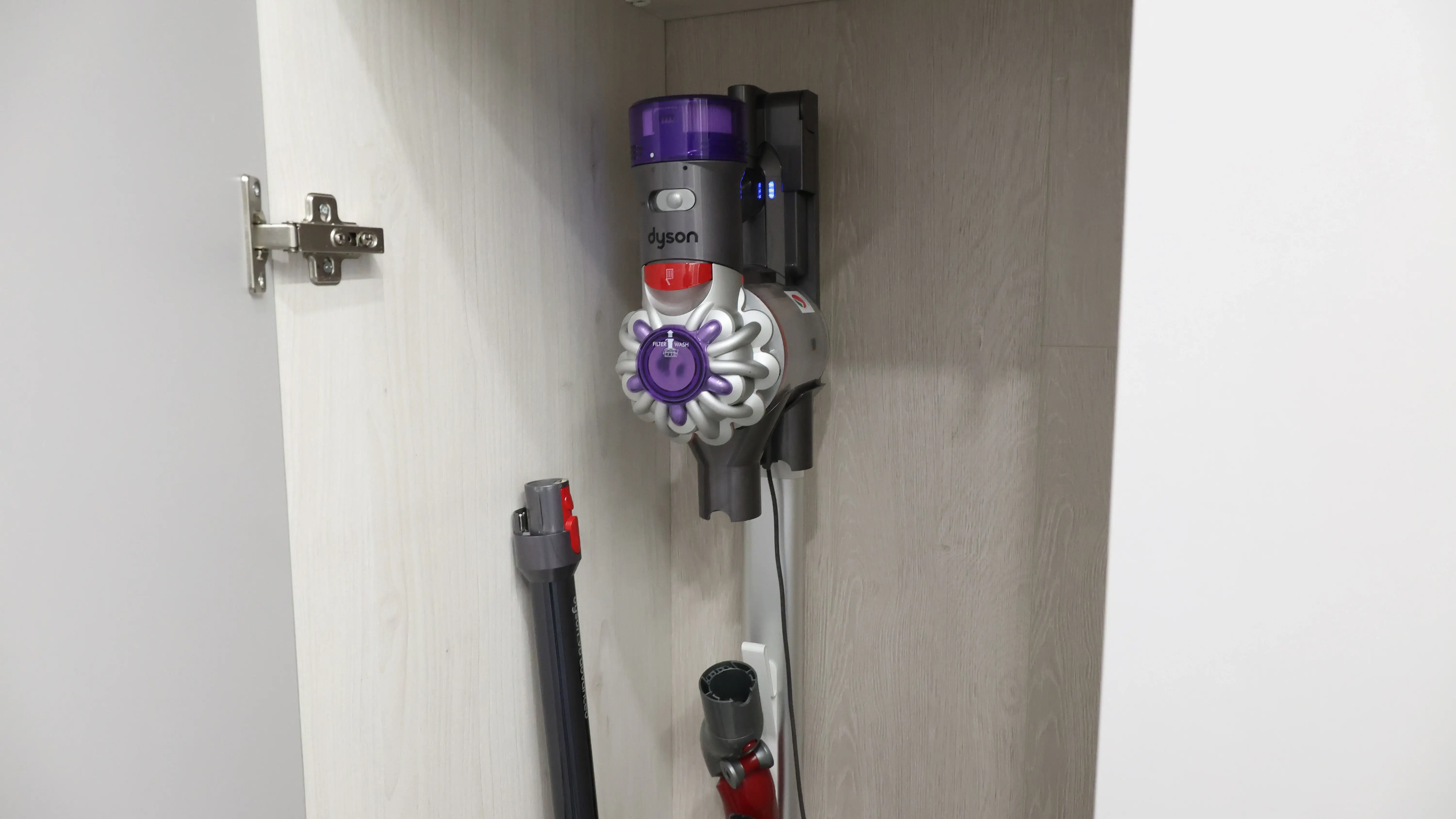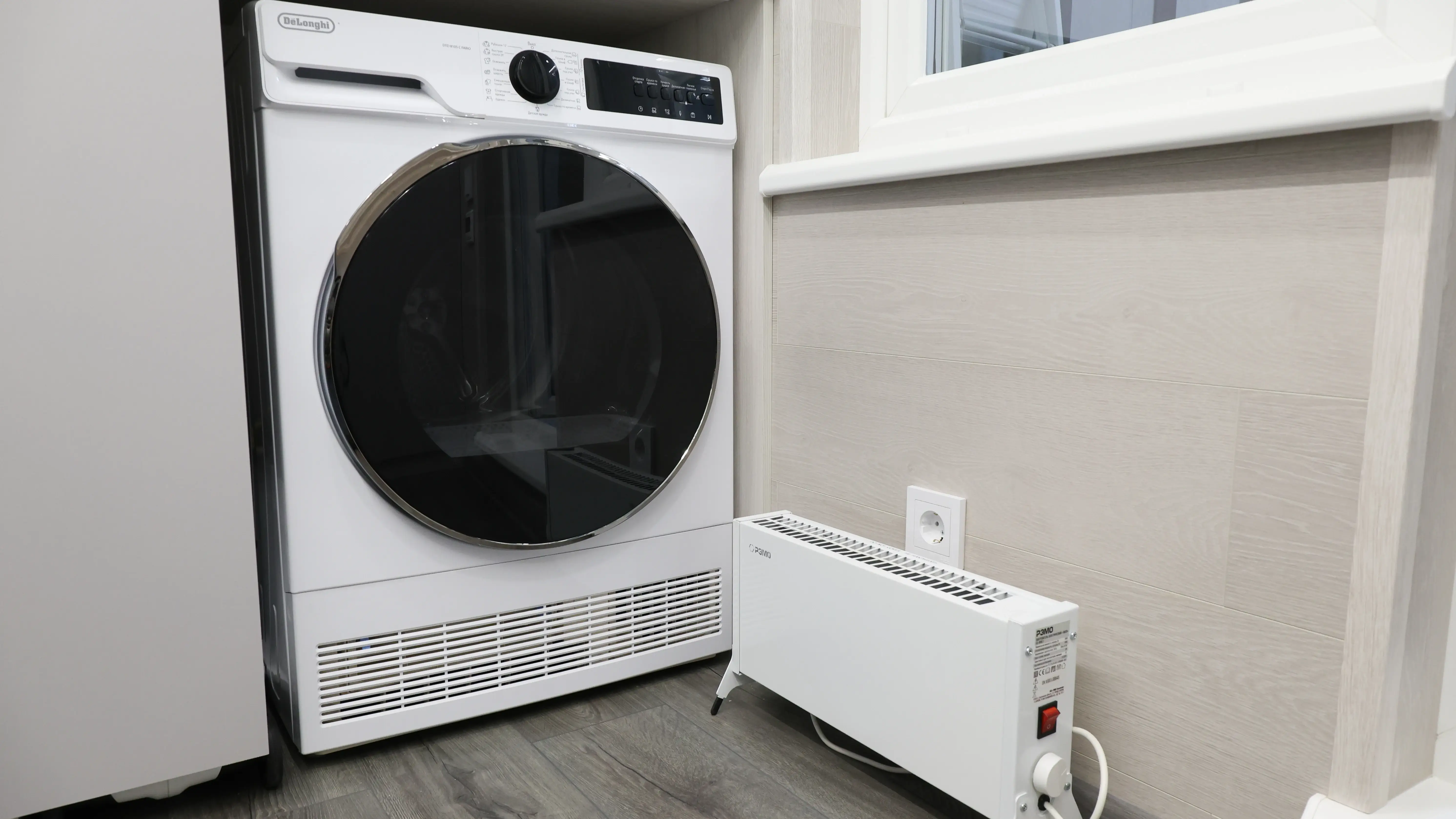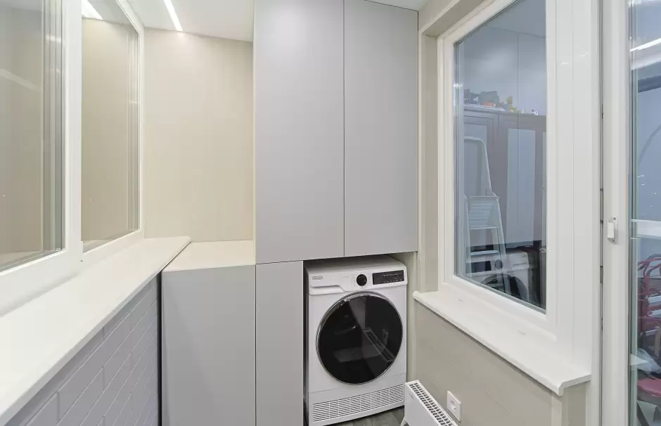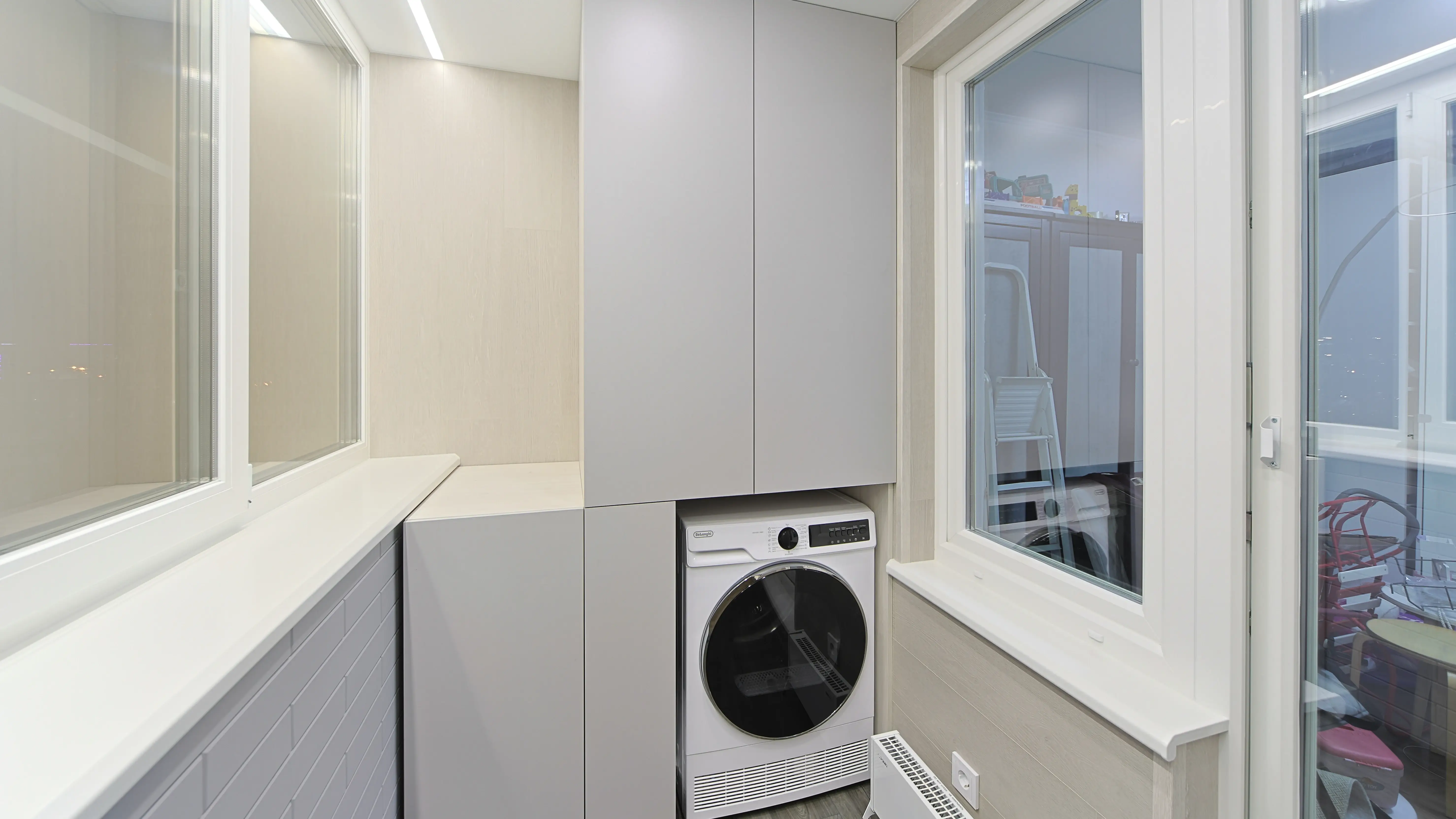 По меблировке и функционалу: с обеих сторон выполнены шкафы с учётом встроенной техники и дополнительных ниш; предусмотрено место под сушильную машину и организована зарядная станция для беспроводного пылесоса. Установлены белые матовые подоконники Duncan на парапете и в зоне балконного блока, смонтирован белый матовый натяжной потолок.