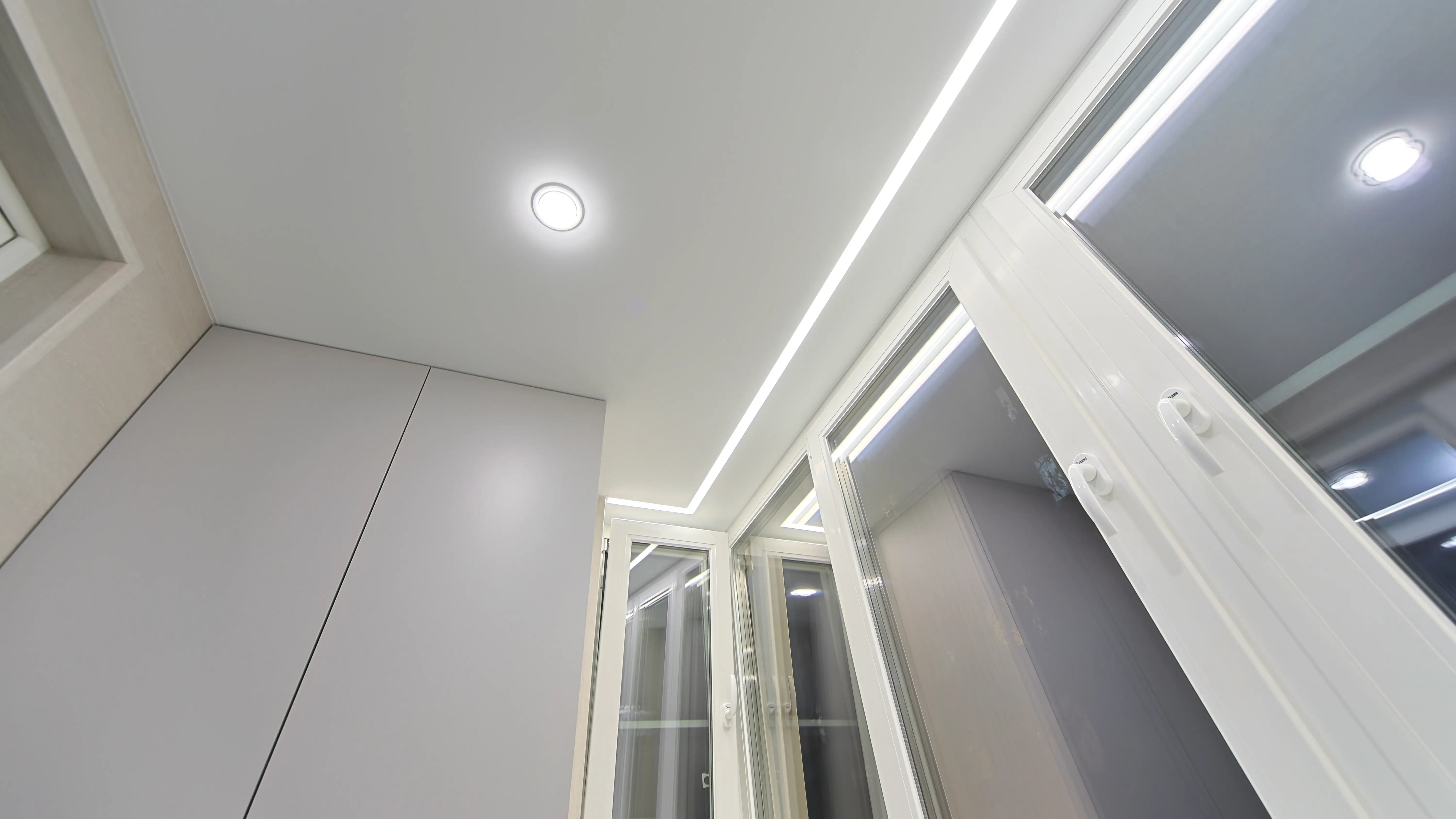 Основные этапы работ: заменено холодное остекление на тёплое — установлен профиль Rehau 70 с режимами откидывания и микрощелевого проветривания. Заменён балконный блок. Выполнено утепление по системе «термос». Стены облицованы влагостойким ламинатом, уложенным горизонтально, а парапет оформлен стеновым паркетом из липы, пропитанным в заданный оттенок. Пол также выполнен из ламината. Смонтирована новая проводка, установлены несколько розеток, тёплый инфракрасный пол под ламинатом с терморегулятором, двухзонный выключатель, два светодиодных спота и светодиодная лента.