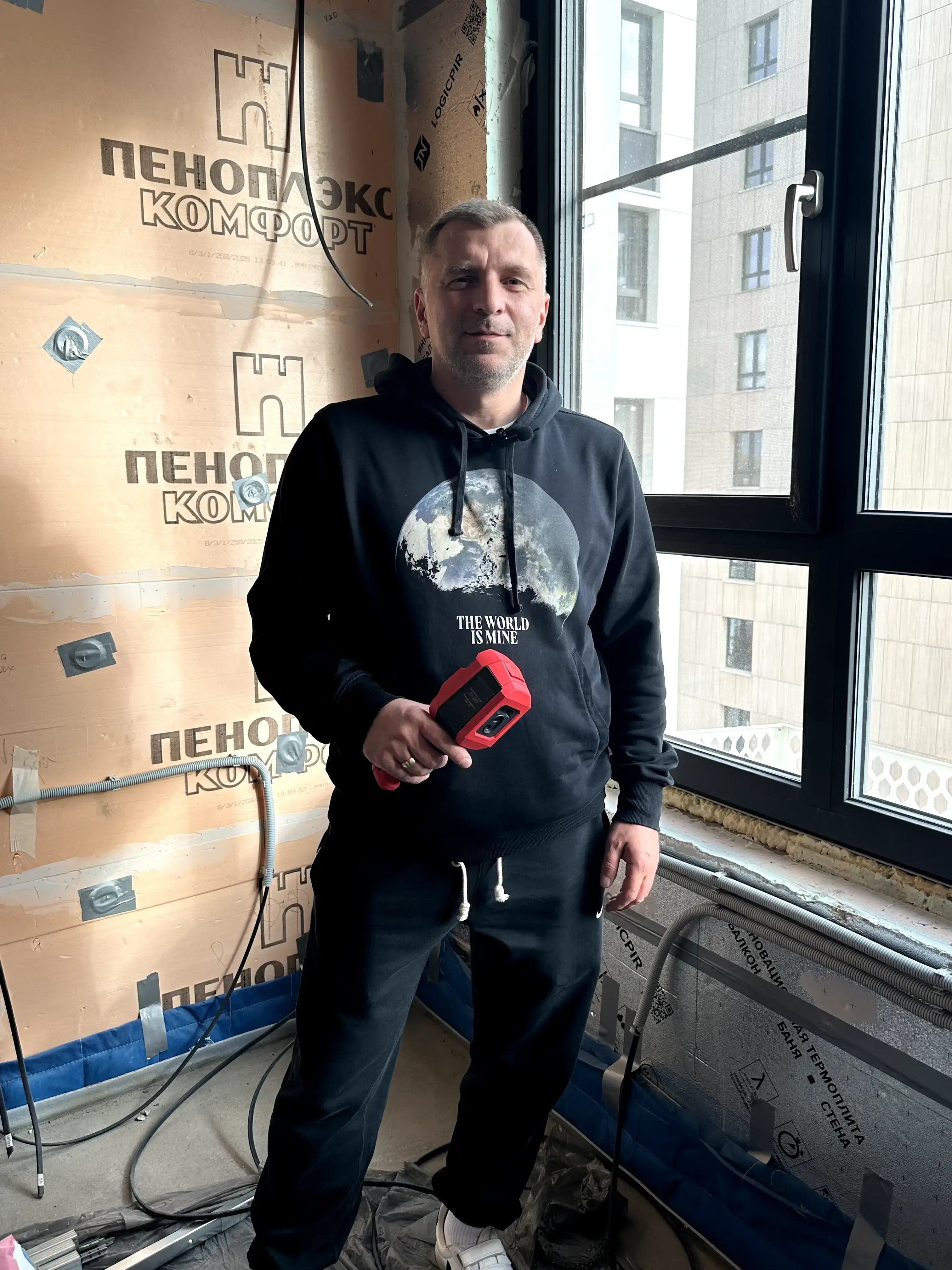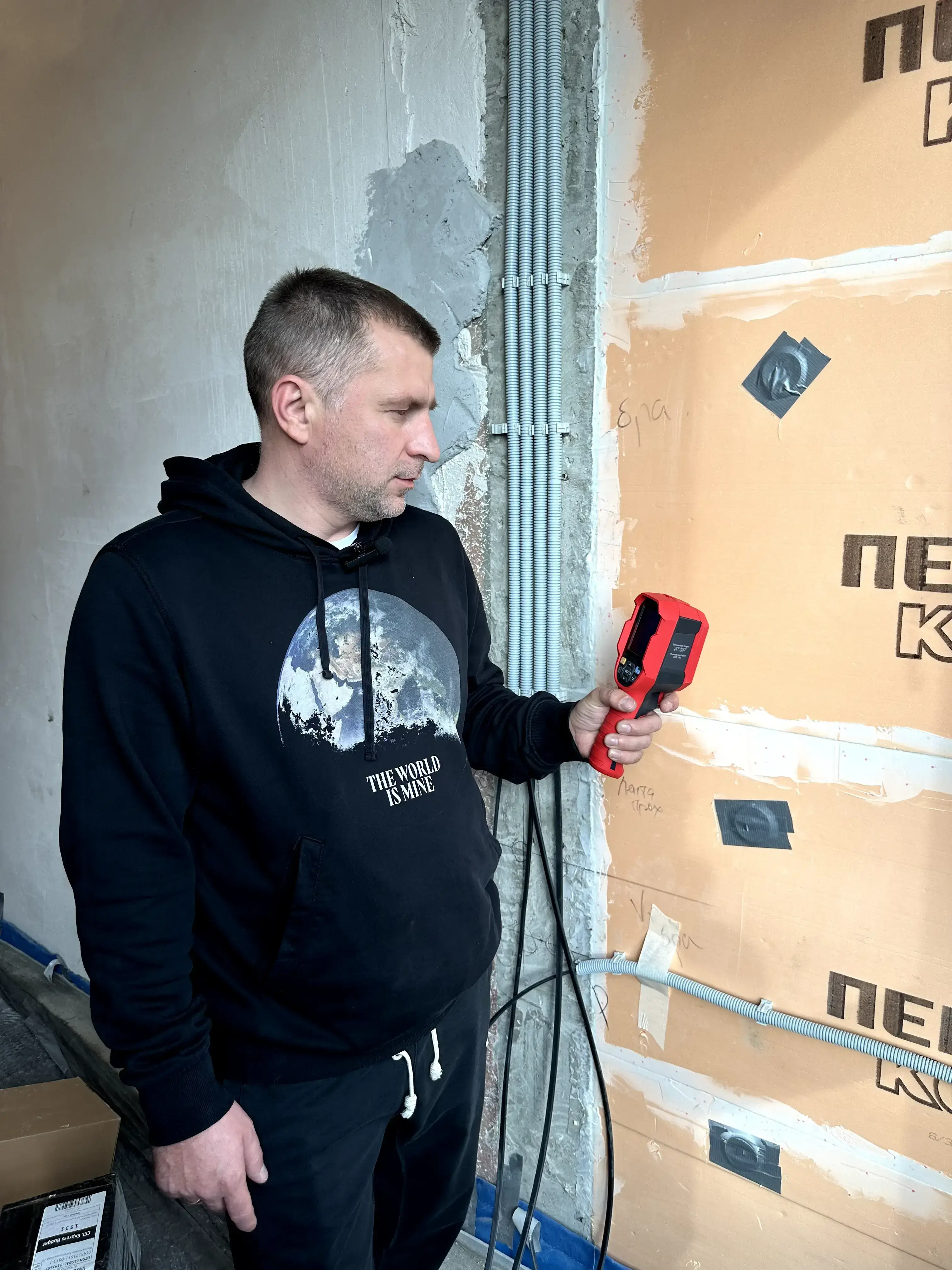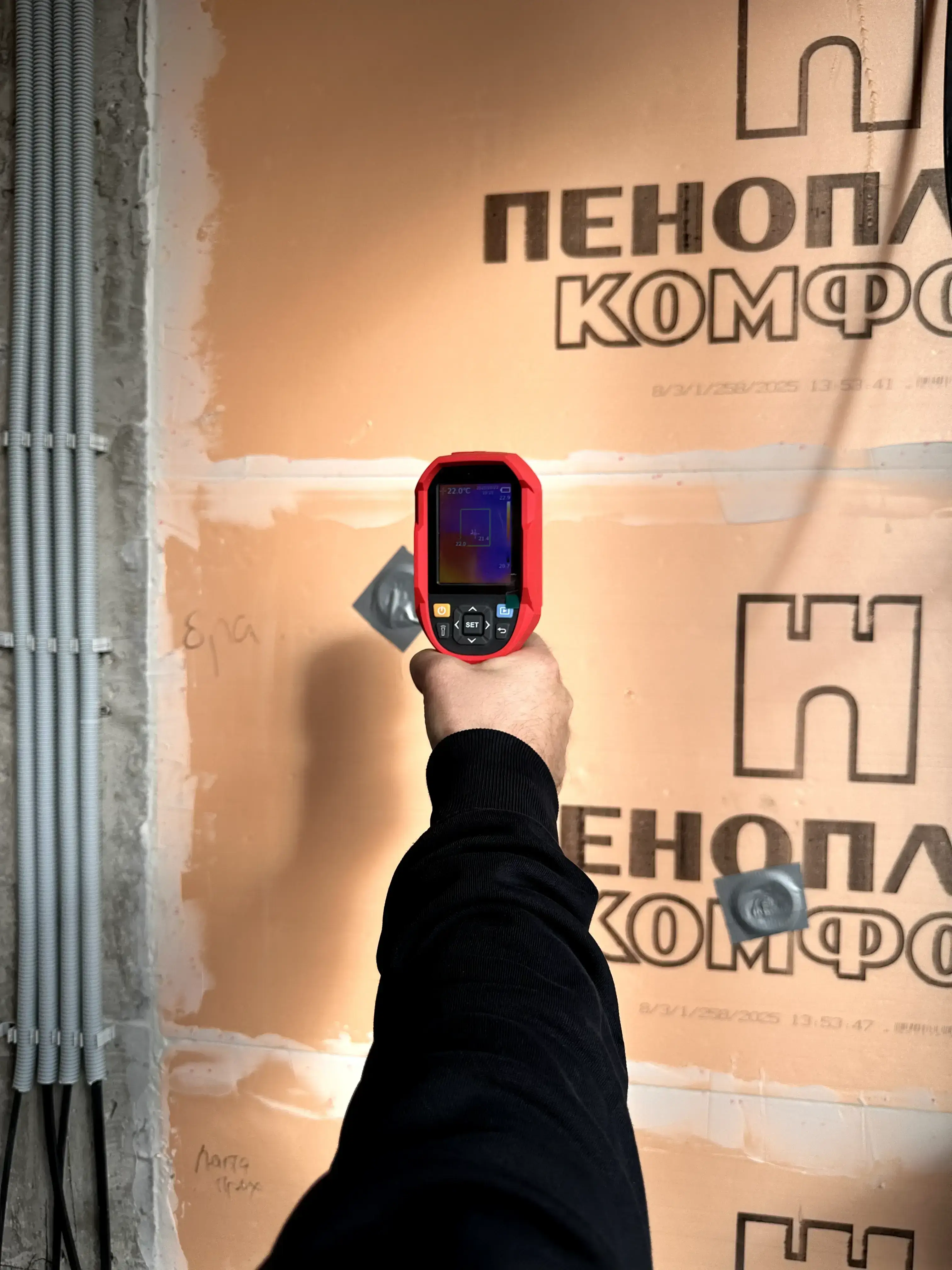 После завершения работ была проведена проверка тепловизором. Температура по поверхности пеноплекса составила около 21,7–22 °C, тогда как бетонные стены дома показали примерно 19,5 °C. Это наглядно подтвердило эффективность системы: утеплённые конструкции лоджии стали теплее основных стен здания.