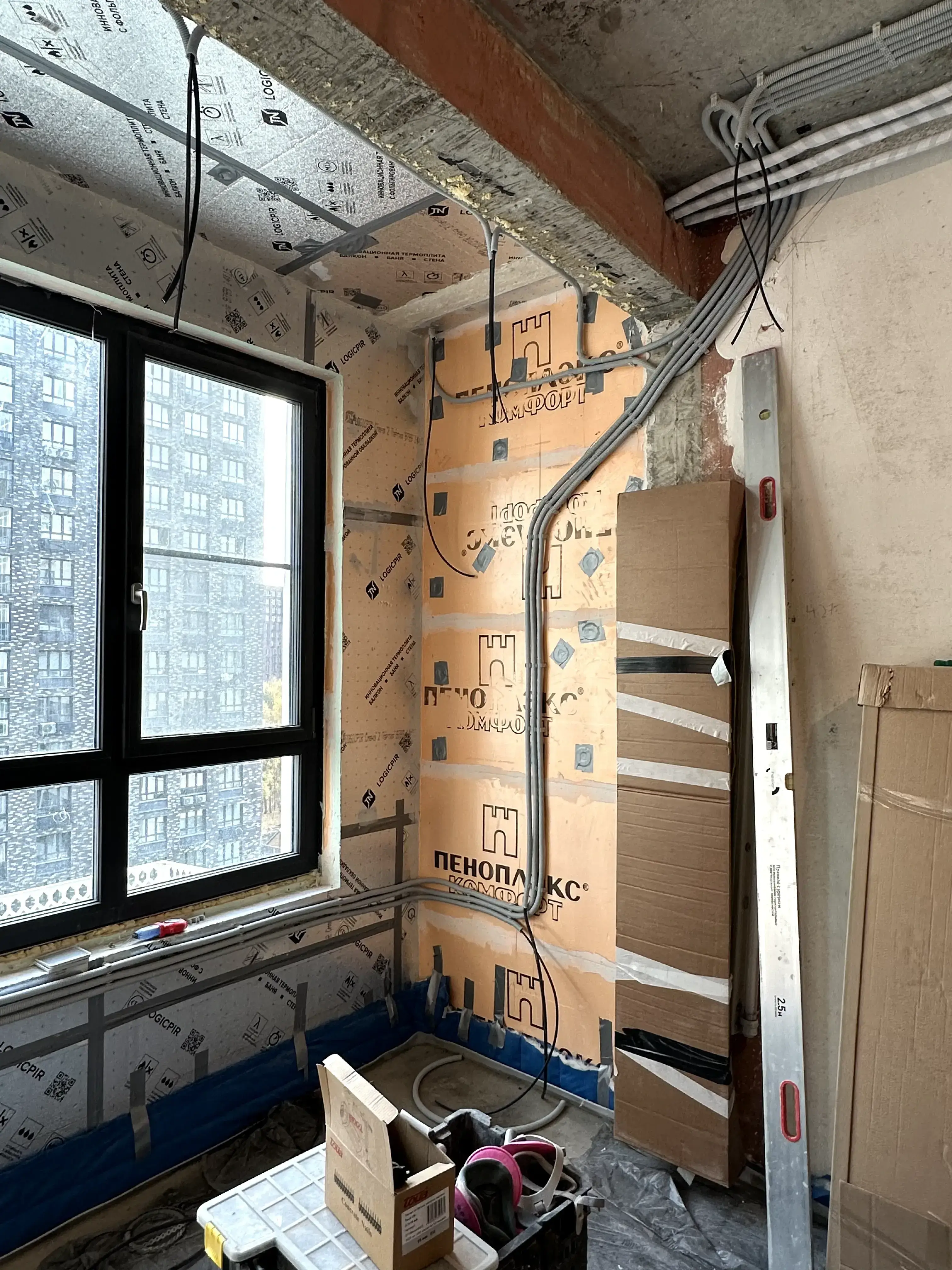 Основной задачей стало создание тёплого пространства, присоединённого к комнате, с надёжной защитой от сильного продувания вентилируемого фасада. Стена со стороны фасада была утеплена в два слоя: использованы пеноплекс и PIR-панели, что позволило исключить мостики холода и обеспечить необходимую теплоизоляцию. Потолок также утеплён PIR-панелями, а все стыки и примыкания тщательно герметизированы.